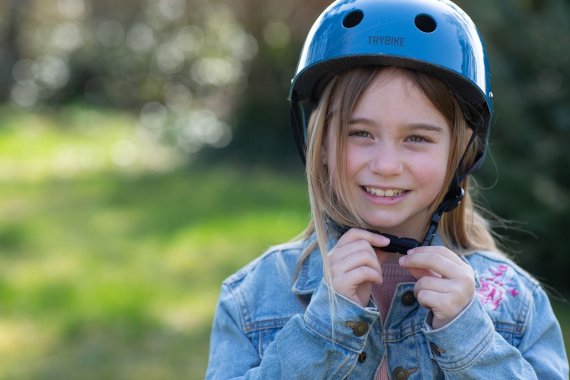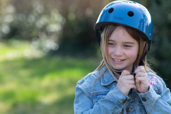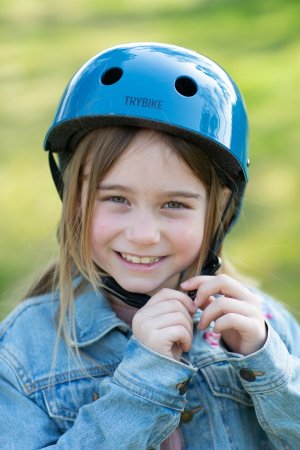 Smart blå cykelhjälm i retrolook från Trybike, storlek XS.