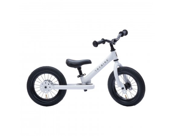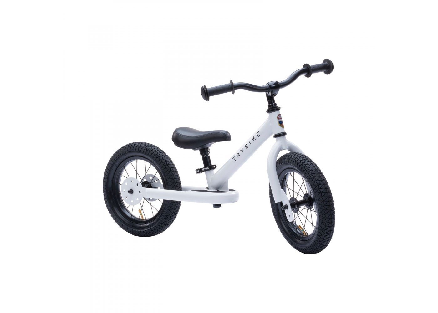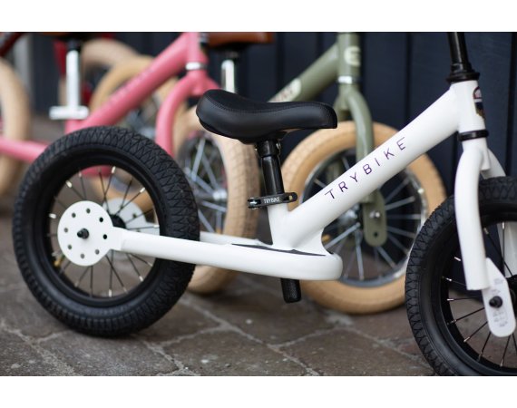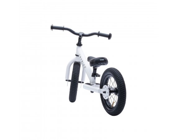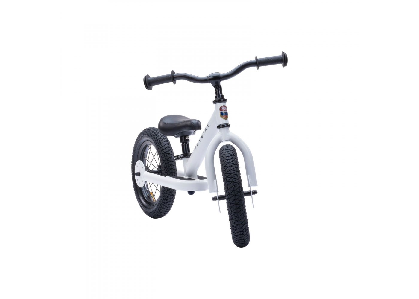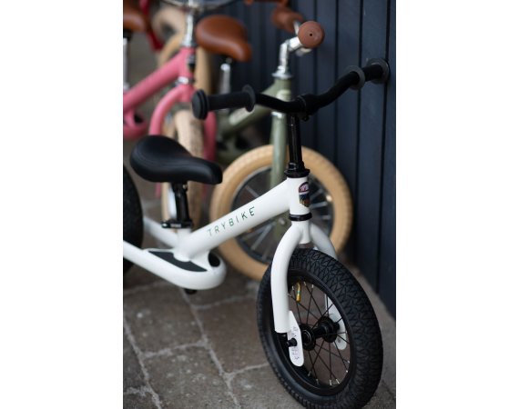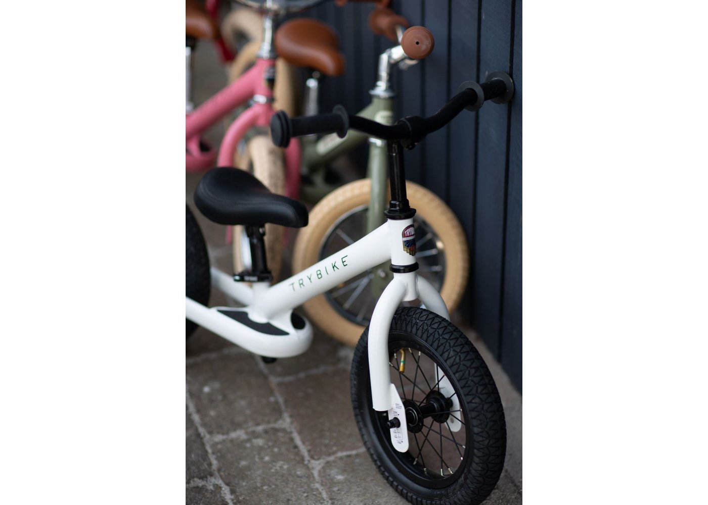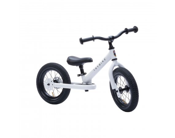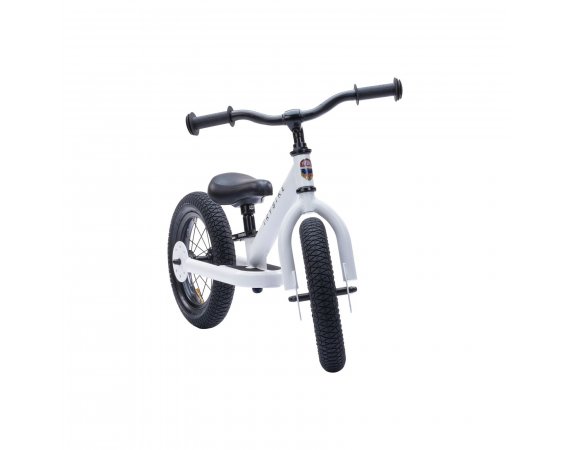 Tuff balanscykel från Trybike i vitt med svarta hjul.