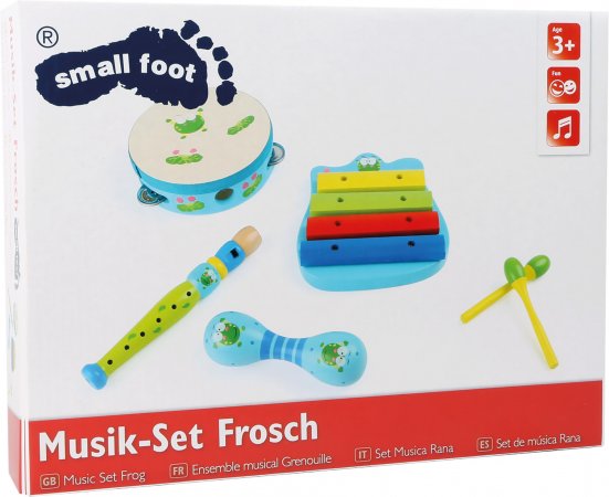 Här får du en liten xylofon med två trumpinnar, en skallra, en flöjt och en tamburin i vackert målat trä med grodbilder.
