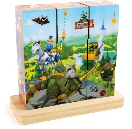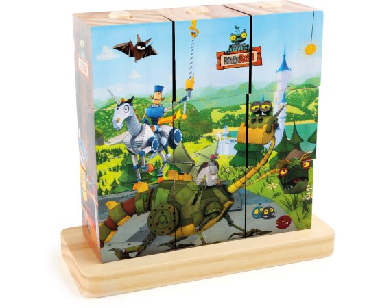 Träpussel bestående av nio klossar som har motiv på fyra sidor.