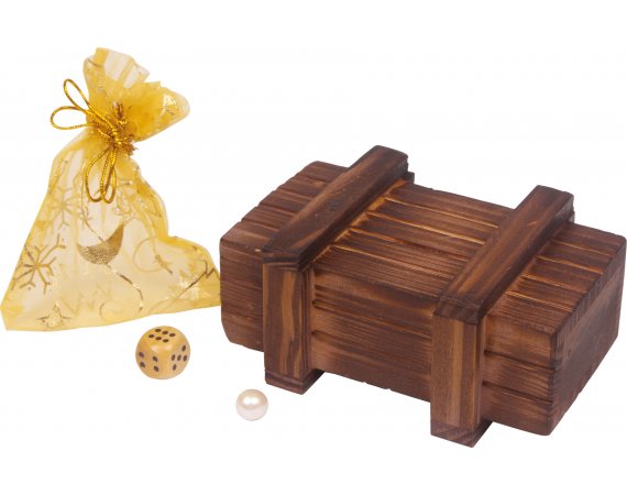 Levereras med en liten trätärning, pärlor och en liten väska av guld.