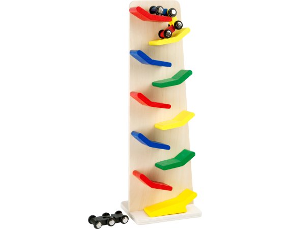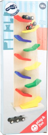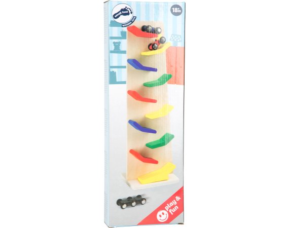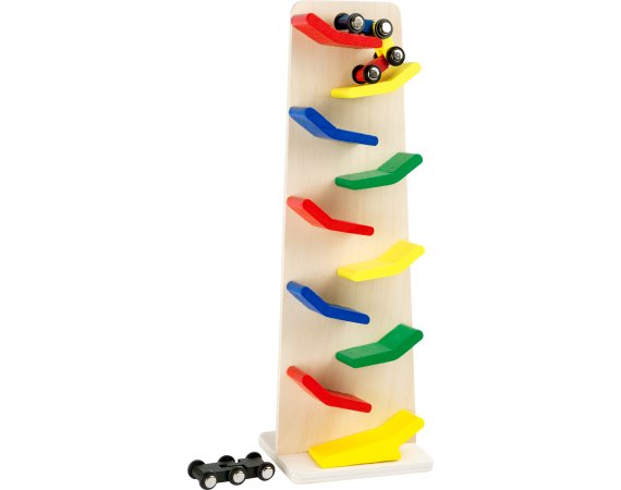 Setet består av en biltrappa och 3 färgglada bilar. En rolig och solid leksak som aldrig blir tråkig att ha kul med ensam eller med en vän. Placera bilarna högst upp på banan och se dem klättra nerför trappan samtidigt som de bullrar!
