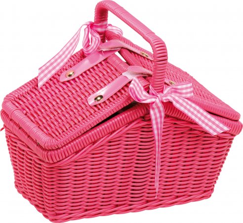 En praktisk flätad korg i plast med kardborrstängning och snyggt fodrad med rutigt tyg. Levereras med ett kaffeset med fina blommor och metallservis.