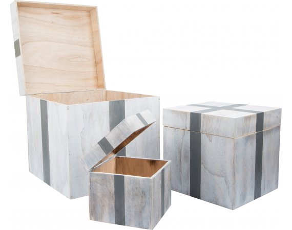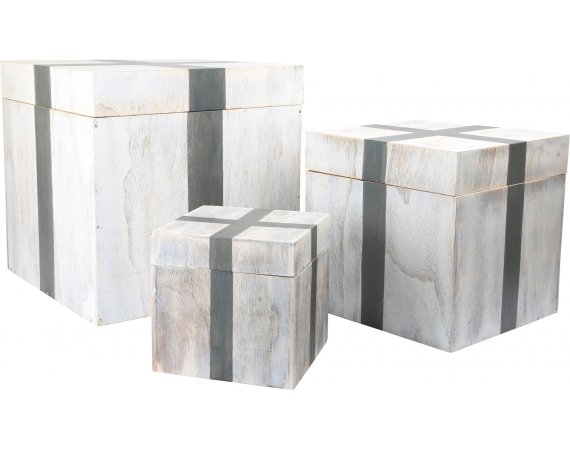 Tre träaskar som visuellt ser ut som inslagna presenter