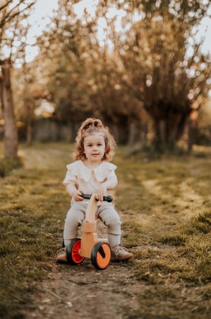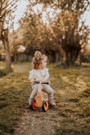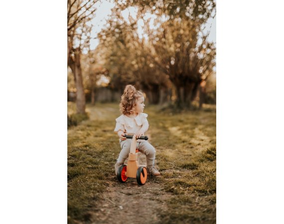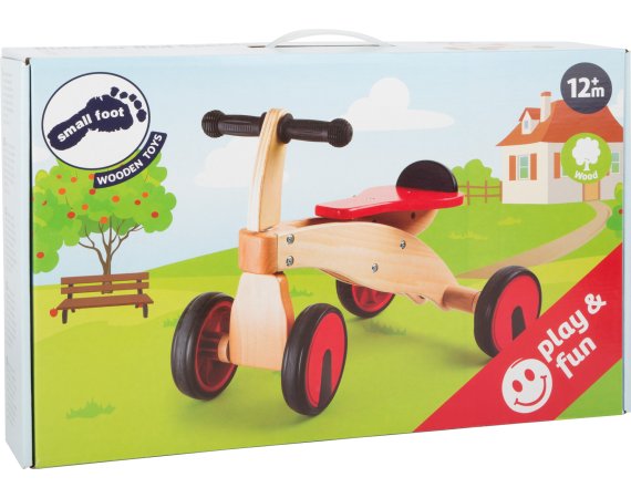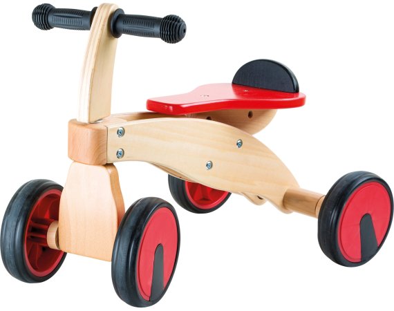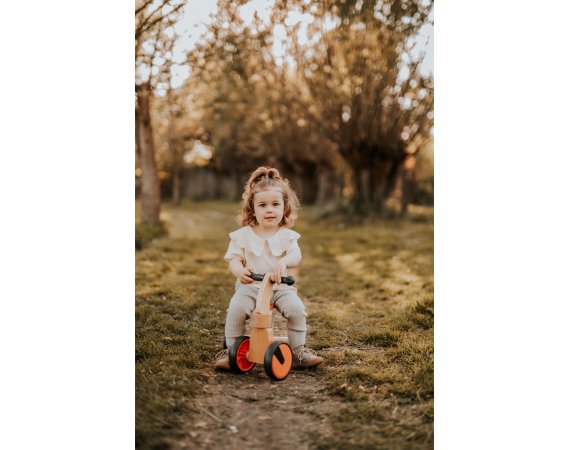 En säker förstagångscykel i natur- och röd färg, tillverkad av trä.