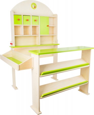 Marknadsståndet har många hyllor, tre lådor och en skjutdörr. Det har också en klocka för att ange öppettider. Det finns plats för många frukt- och grönsakslådor, eller kanske ska något helt annat säljas från boden.