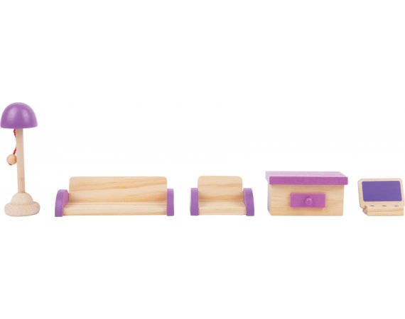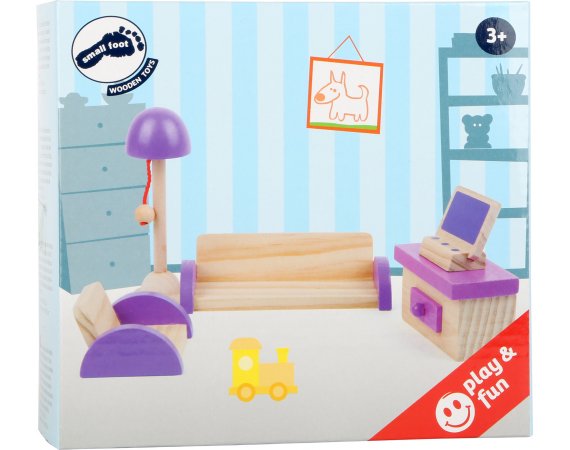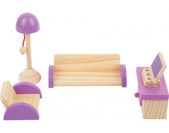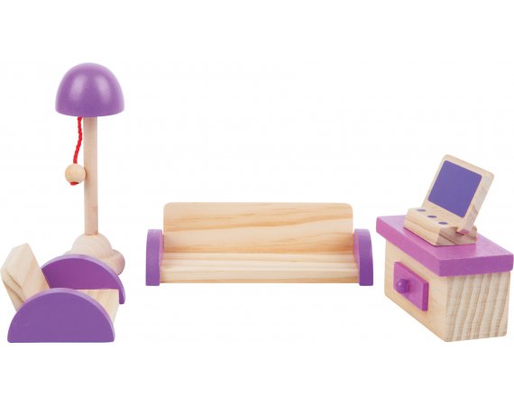 Saknar din lilla tjej möbler till sitt dockhus, eller älskar hon bara att leka med små dockor och möbler. Oavsett anledningen, får hon här ett fint vardagsrum med tv, lampa och två soffor.