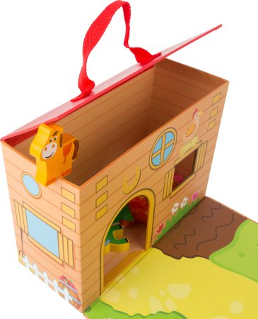 När den öppnas avslöjas en hel bondgård med djur och åkrar. Figurerna är alla gjorda av FSC® 100%-certifierat trä.