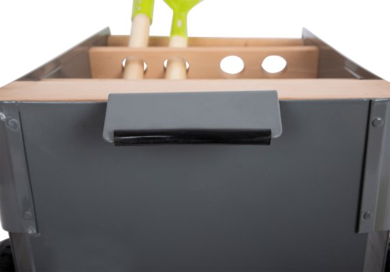 Vagnen har massiva gummihjul och vagnen har extra hål, så det är möjligt att komplettera med fler trädgårdsredskap.