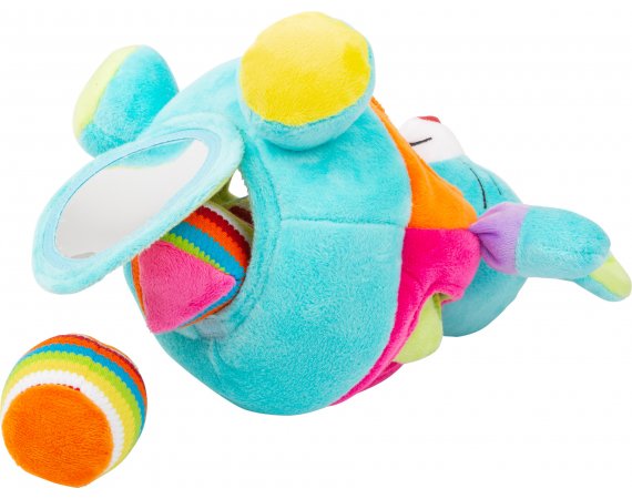 Musen har en spegel i botten och bollar som knarrar, ringer och gnisslar - för att främja motoriska färdigheter och få uppmärksamhet hos små barn.
