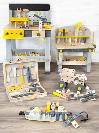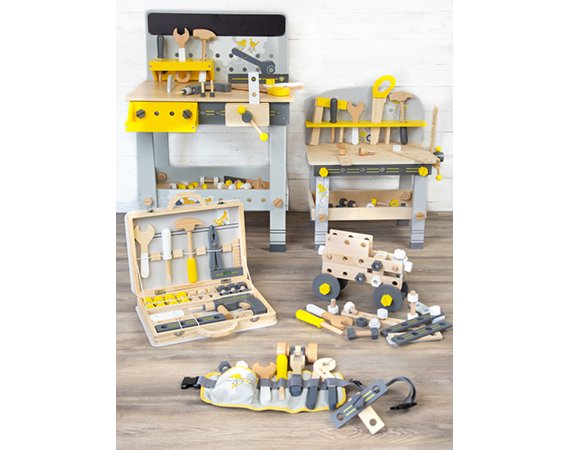 Med detta justerbara verktygsbälte i klassiska färger har minihantverkaren händerna fria och utrustningen redo att utföra hantverksuppgifter! Setet består av skruvmejsel, skiftnyckel, skruvar och trä med hål. Det vildaste är nog rörtången och soporna! Alla verklighetstrogna verktyg. Bältet är justerbart och utrustat med ett praktiskt klickspänne.