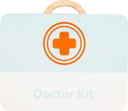Den robusta lådan och alla medicinska instrument är i vackert naturligt trä, tyg och metall och i en barnvänlig design.