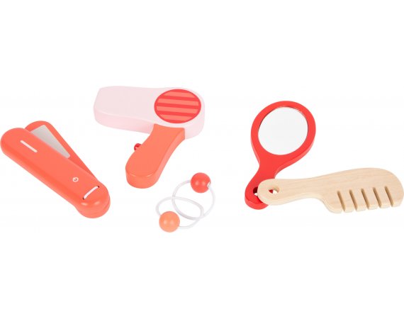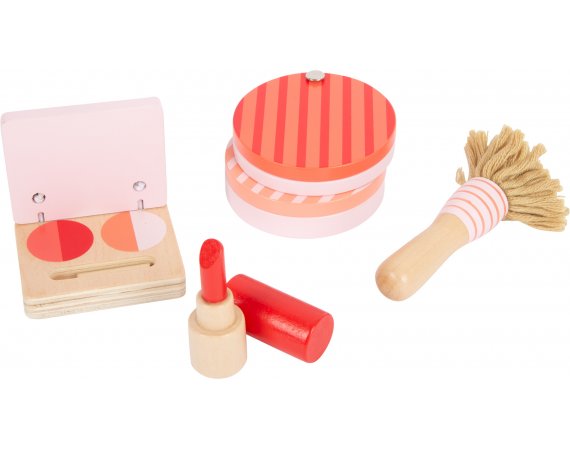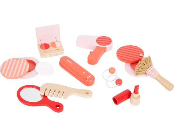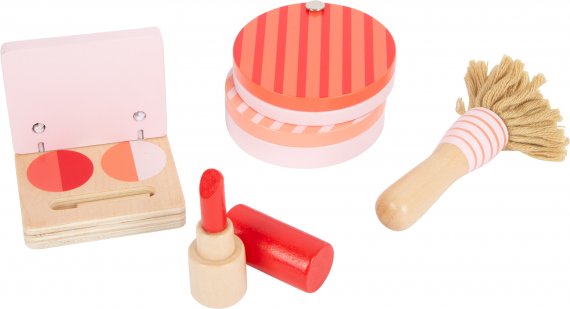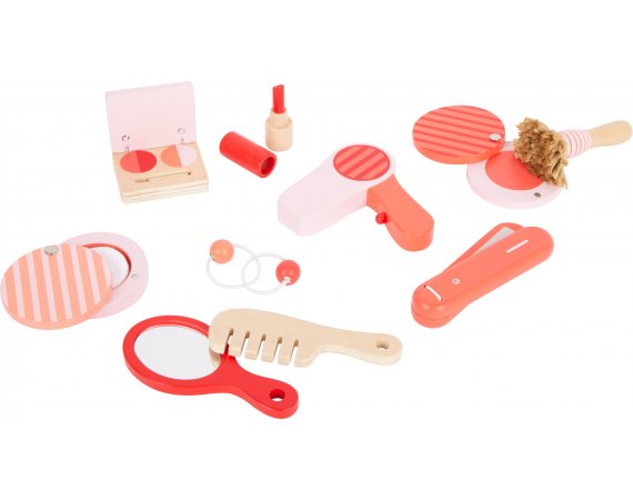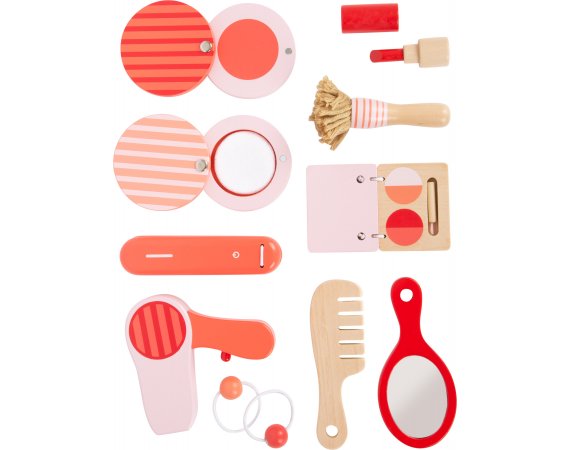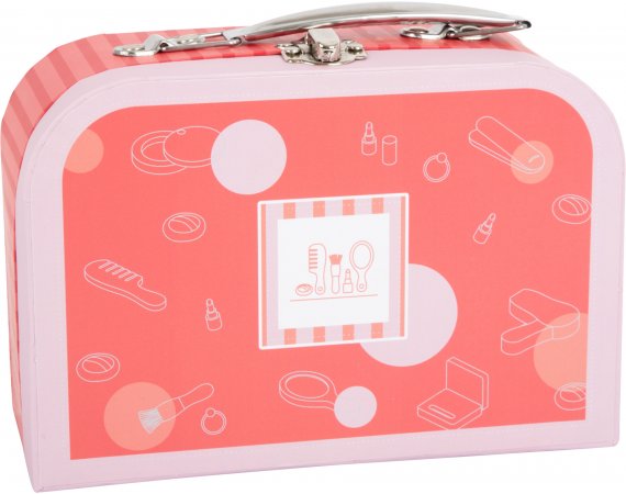 Lekväskan består av alla slags sminkartiklar som puder, rouge, puderborste, läppstift, handspegel och ögonskugga. Dessutom plattångar, hårtorkar, kammar och riktiga elastiska band för styling. Det finns tillräckligt med utrymme i väskan för att förvara alla redskap säkert, så setet kan tas med dig när du är på språng.