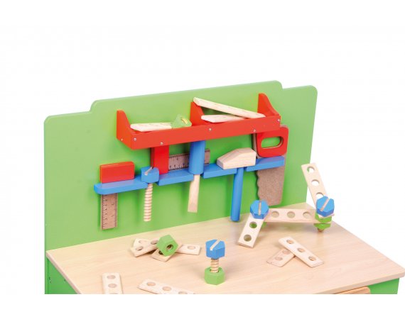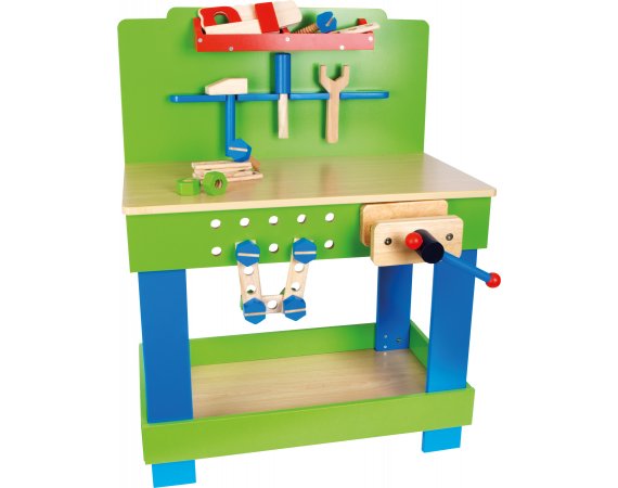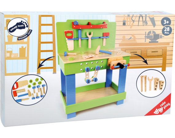 Supersmart och färgstark arbetsbänk med tillbehörArbetsbänken levereras med hammare, skruvar, såg och mycket mer, det blir inte tråkigt. Här kommer den lilla hantverkaren till liv!