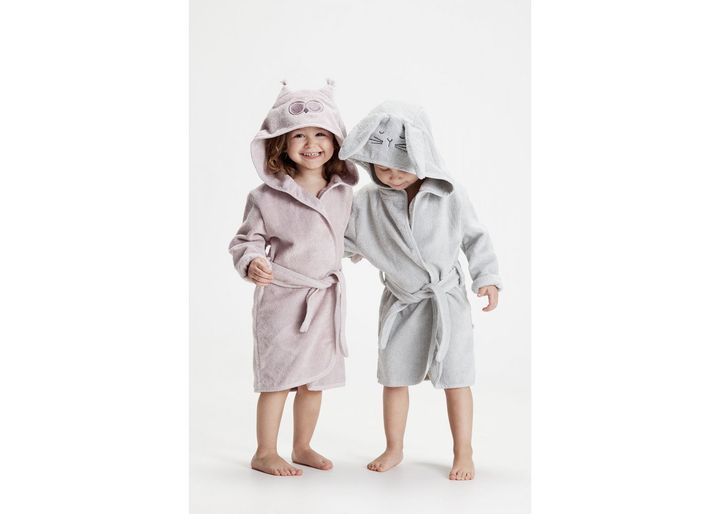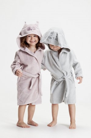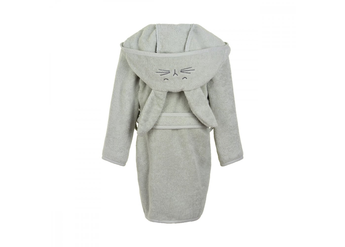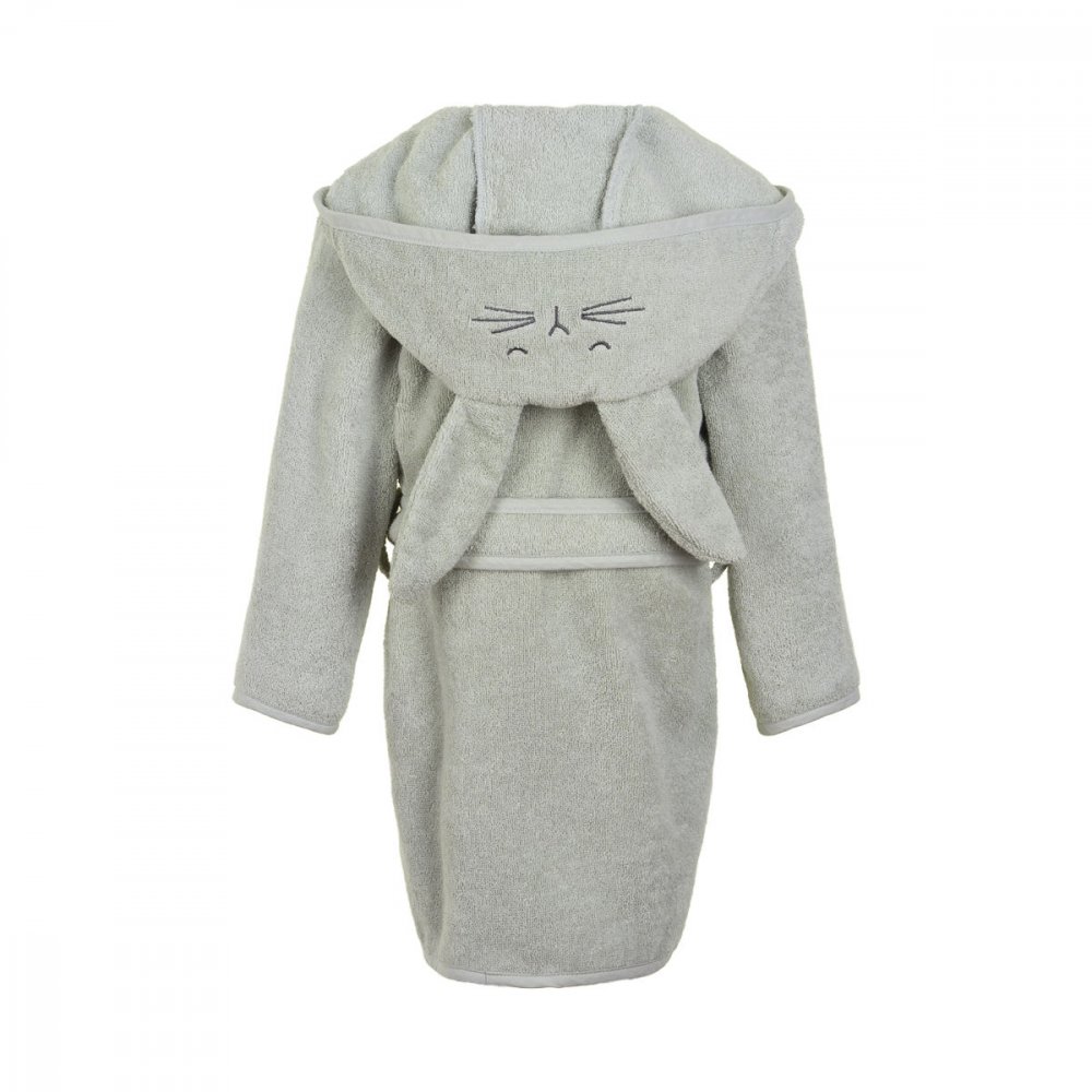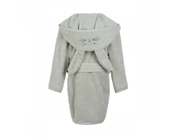 Härlig badrock i ekologisk bomullsfrottéBadrockens huva har broderat djurmotiv och påsydda öron. Dessutom ett band i nacken som gör den lätt att hänga upp efter användning.