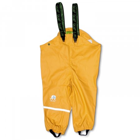 Regnbyxorna i storlek 70-100 har bib, justerbara hängslen och klickspännen.