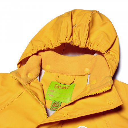 Praktiskt och tåligt PU-regnset från CeLaVi, Mineral Yellow100% vind- och vattentätt regnset med ett uppmätt vattentäthetstryck på 5000 mm.