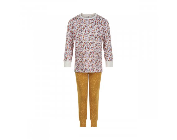 Läckert och mjukt pyjamasset i jersey med topp och byxor.Nattlinnet har blommor överallt och vita helfärgade ribbade kanter i halsen och vid handlederna. Byxorna är helfärgade med prickar och har en elastisk kant i midjan.