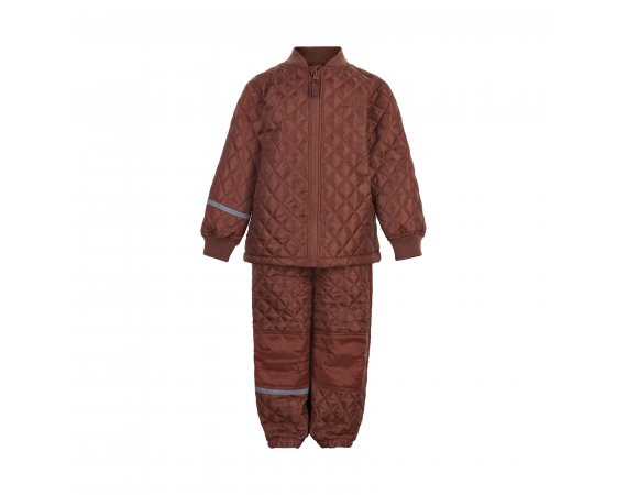 Termosetet är quiltat, slitstarkt, avger och isolerar värme. Jackan öppnas framtill med en genomgående dragkedja och kan dras åt med en innerelastik. Den har en ribbad kant i nacken och händerna som håller den tät och gör den bekväm att bära. Termokläderna har vatten- och smutsavvisande nylon på knäna och baken. Dessutom synliga reflexer, god andningsförmåga och resår vid fot och midja Material: 100% polyester
