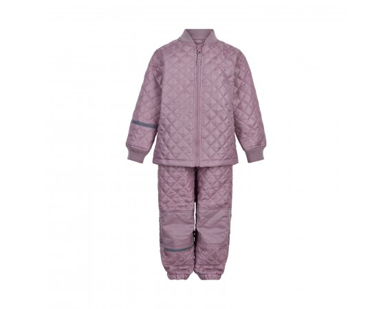 Termosetet är quiltat, slitstarkt, avger och isolerar värme. Jackan öppnas framtill med en genomgående dragkedja och kan dras åt med en innerelastik. Den har en ribbad kant i nacken och händerna som håller den tät och gör den bekväm att bära. Termokläderna har vatten- och smutsavvisande nylon på knäna och baken. Dessutom synliga reflexer, god andningsförmåga och resår vid fot och midja Material: 100% polyester
