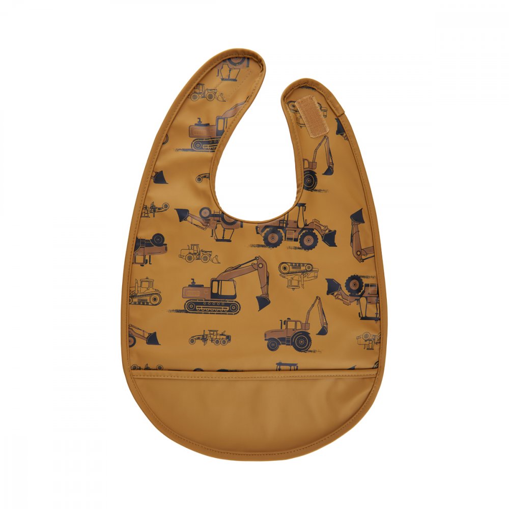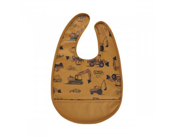 PU mathaklapp i brunt med byggmaskiner från CeLaVi.Haklappen har en ficka för att samla in matrester och spilld vätska, vilket kan vara riktigt bra när de första självständiga måltiderna ska intas. Samtidigt skonar det barnets kläder från fläckar. Eftersom haklappen har PU-beläggning är den vattentät och lätt att torka av. Haklappen stängs i nacken med kardborreband, tillverkad av 100% polyester