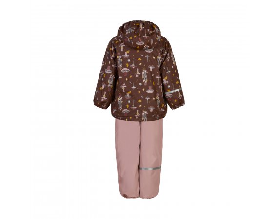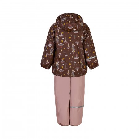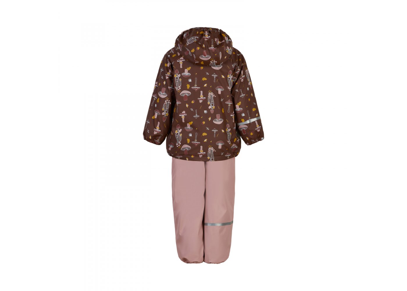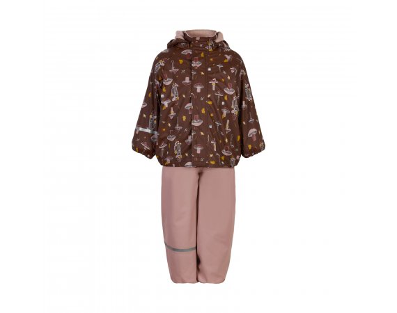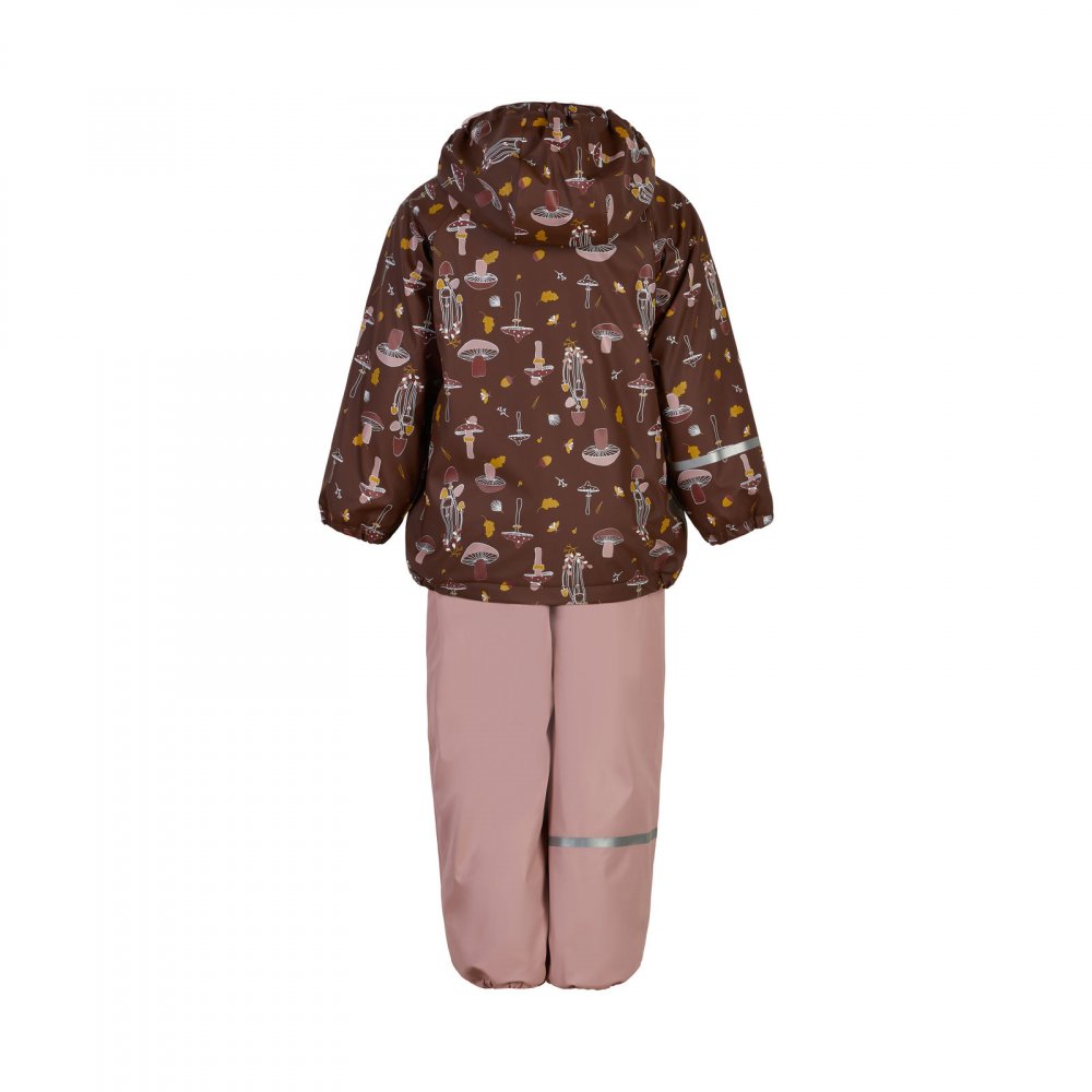 Varma, praktiska och slitstarka recycled PU-regnkläder i brunt och rosa med ett vackert svampmönster och läckert fleecefoder.