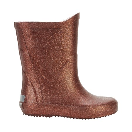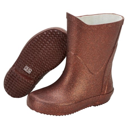 Kvalitetsgummistövlar i brunt med glitter och ett praktiskt reflex på hälen. Stöveln har ett lätt textilfoder och avtagbara sulor. Stöveln är smalare i hälen, vilket säkerställer god komfort när barnet ska leka i dem i flera timmar.