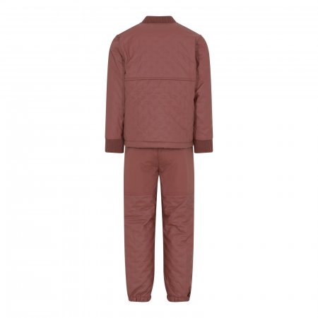 Termosetet är fodrat, quiltat, slitstarkt, avger och isolerar värme. Jackan öppnas framtill med en genomgående dragkedja och kan dras åt med ett invändigt gummiband. Den har ribbad kant vid halsen och händerna som håller den tät och gör den behaglig att bära.