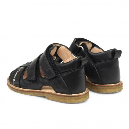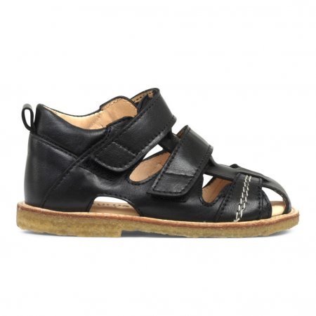 Smart sandal med två kardborreband och snygga vita kontrastsömmarSandalen har ett fast hällock som ger maximalt stöd, stängd tå och två justerbara kardborreband över fotleden. Innersulan är gjord av mjukt läder och sulan är i mjukt och flexibelt rågummi, vilket säkerställer ett bra fotfäste utomhus.