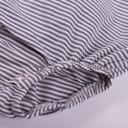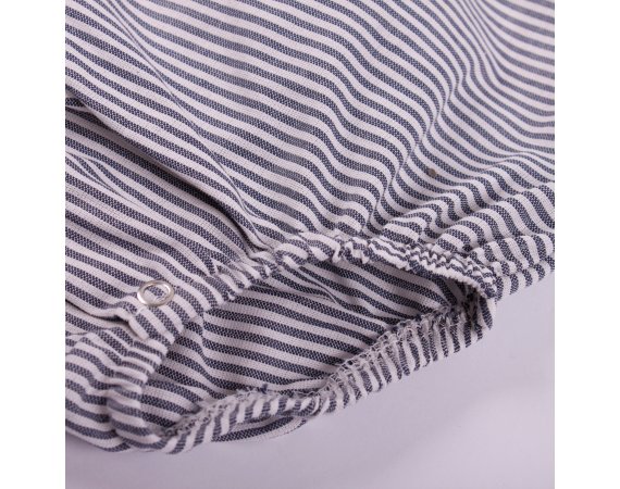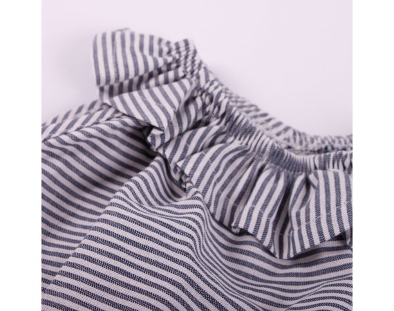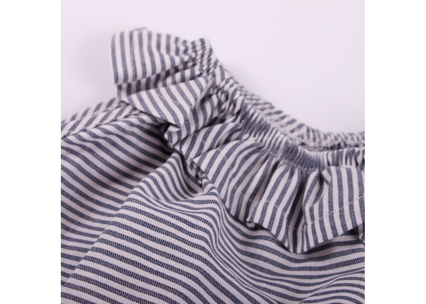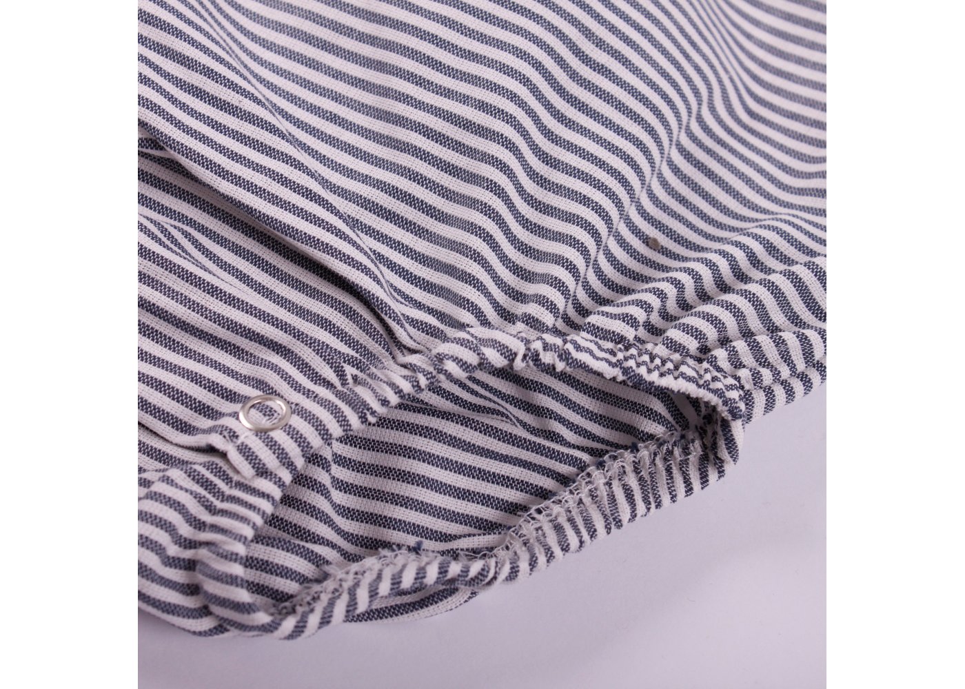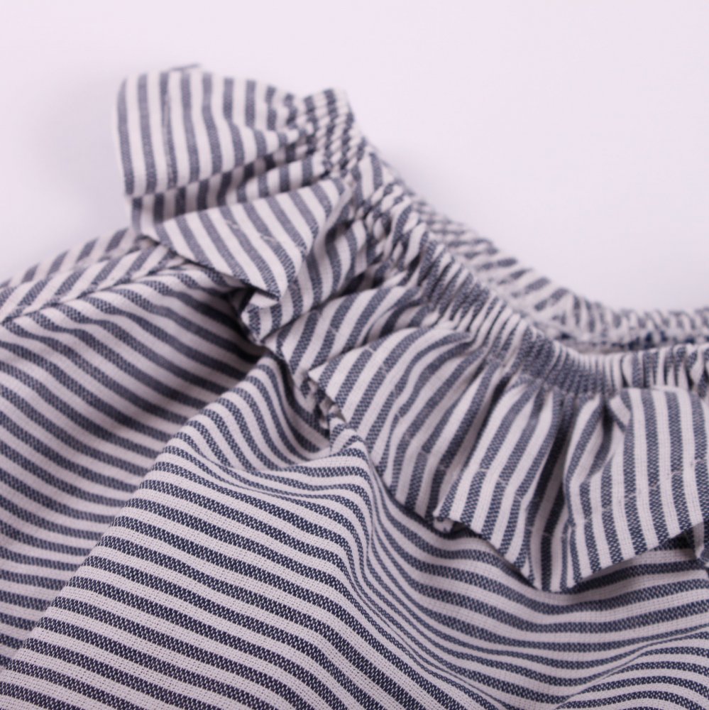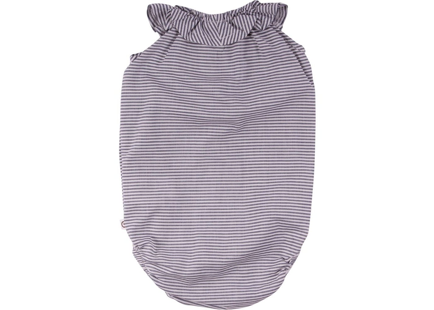 Söt blå- och vitrandig body utan ärmar och med en söt volang i urringningen från Müsli.Bodyn har resår i benöppningarna och stängs med tryckknappar mellan benen. Textil: 100% ekologisk bomull
