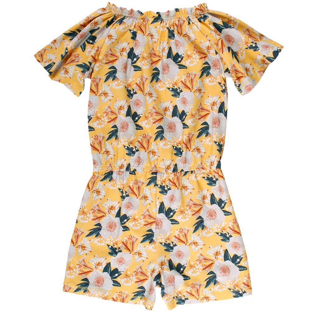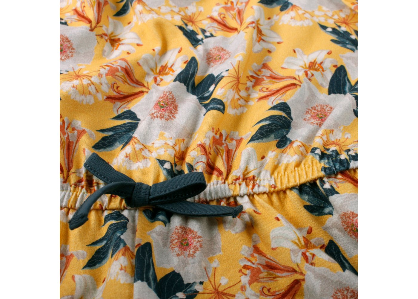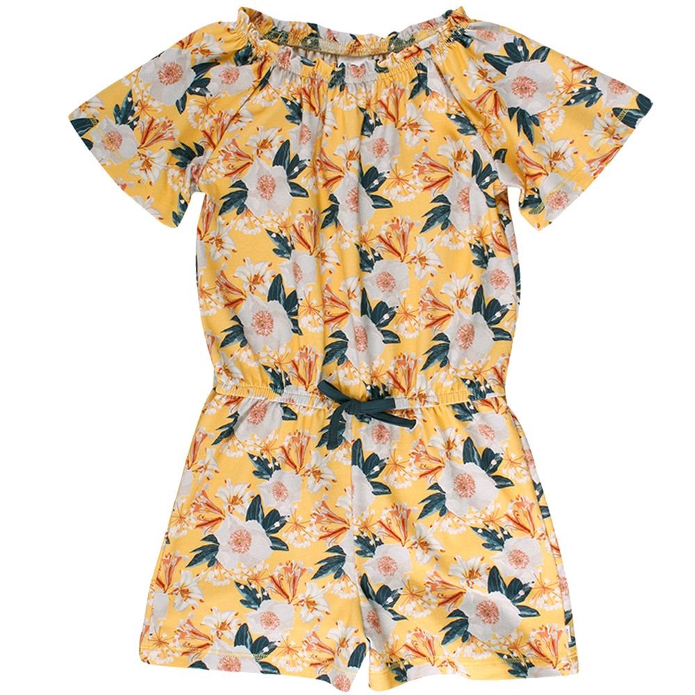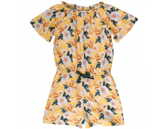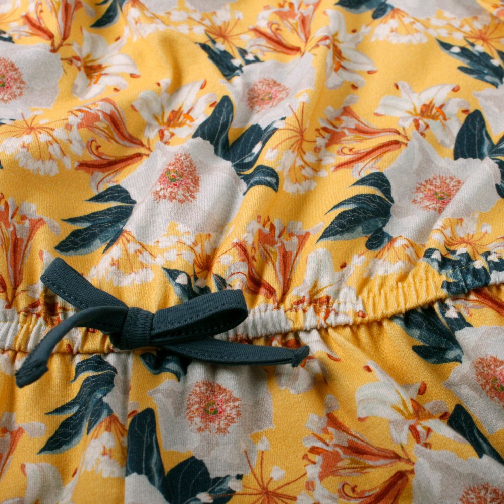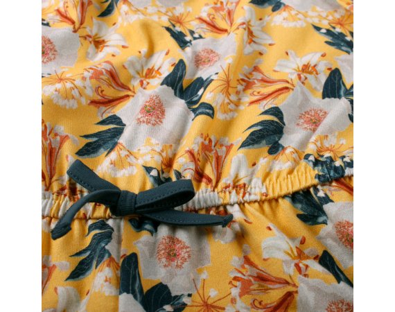 Bedårande sommardräkt med vackra blommor i rosa, vita och gröna nyanser från Müsli.Dräkten har feminina rynkor i urringningen, korta ärmar och korta ben. Den har resår och en fin rosett i midjan. Sommardräkten är gjord i en läcker, mjuk och töjbar bomullskvalitet som gör den bekväm att bära. Textil: 95% ekologisk bomull, 5% elastan