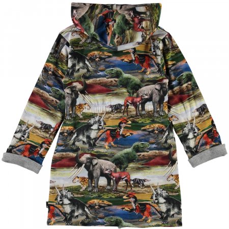 Superfin och mjuk badrock med huva och tryck av förhistoriska djur.Badrocken har små fållar på ärmarna, två praktiska fickor framtill och ett resårband på baksidan. Badrocken stängs med ett praktiskt knytband. Badrocken är fodrad med mjuk frotté och är perfekt att användas både på morgonen, efter bad och vid läggdags.