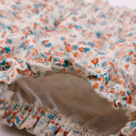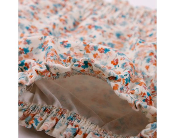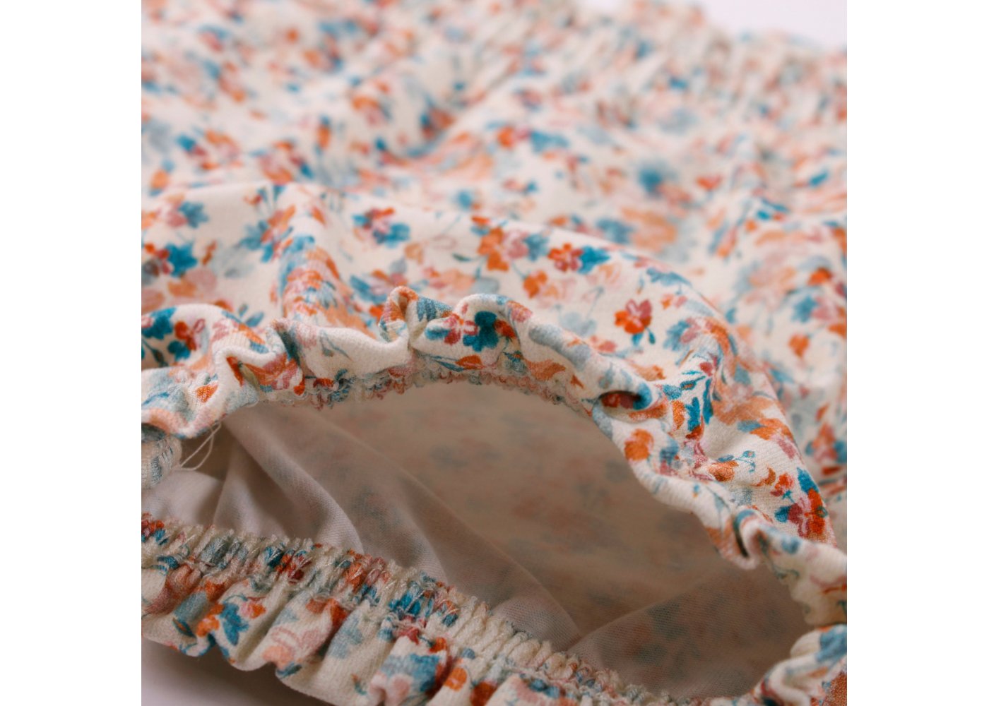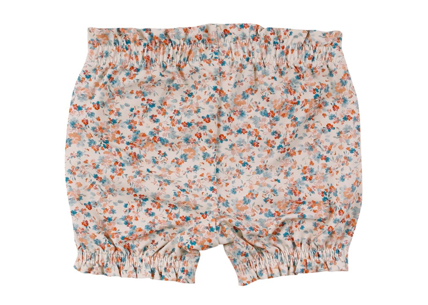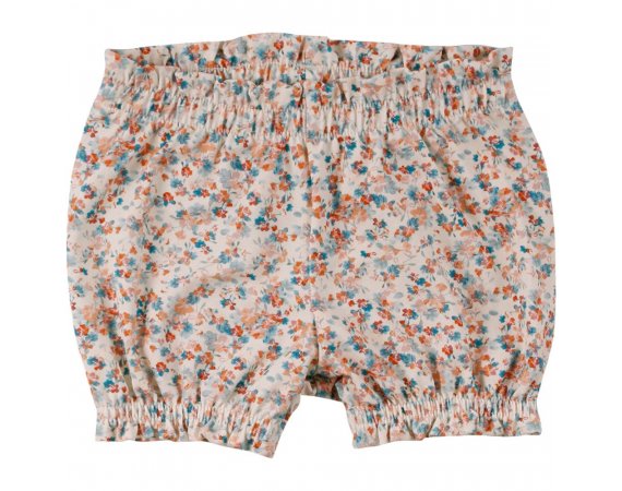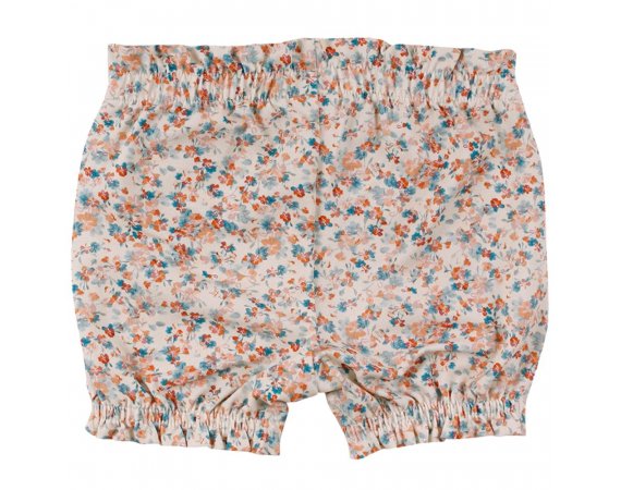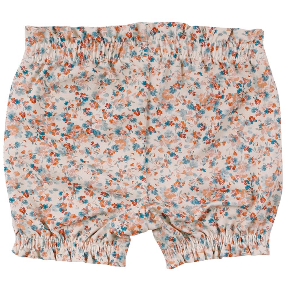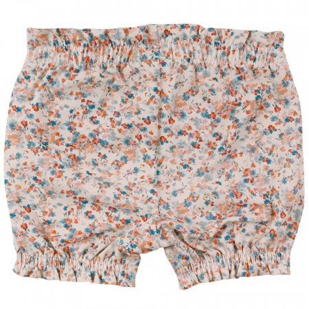 Söta babybloomers i krämfärg med blommor i blått och orange från Freds World.Shortsen har resår i midjan och benöppningarna och är gjorda i en utsökt, mjuk och töjbar bomullskvalitet som gör den bekväm att bära. Textil: 95% ekologisk bomull, 5% elastan