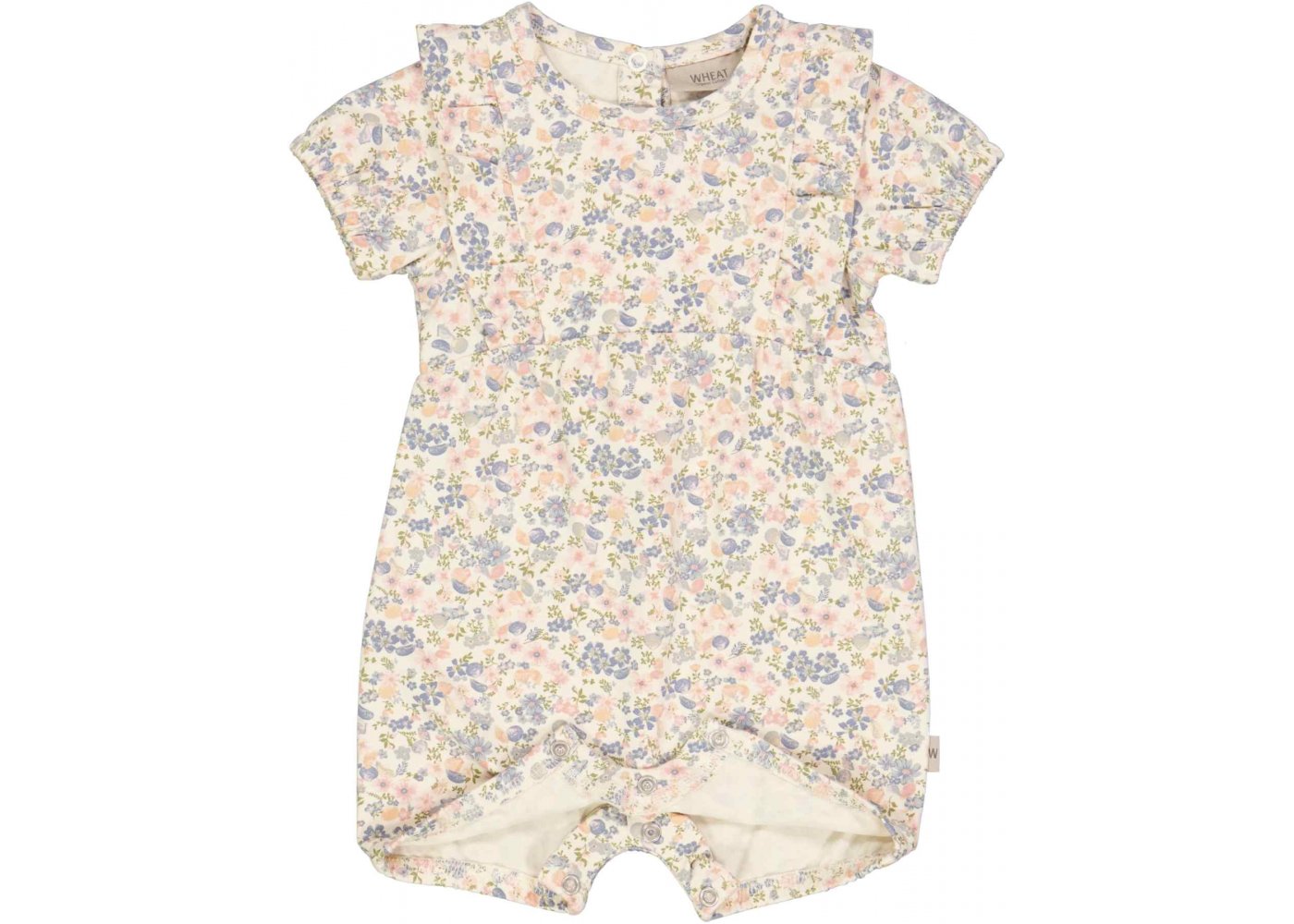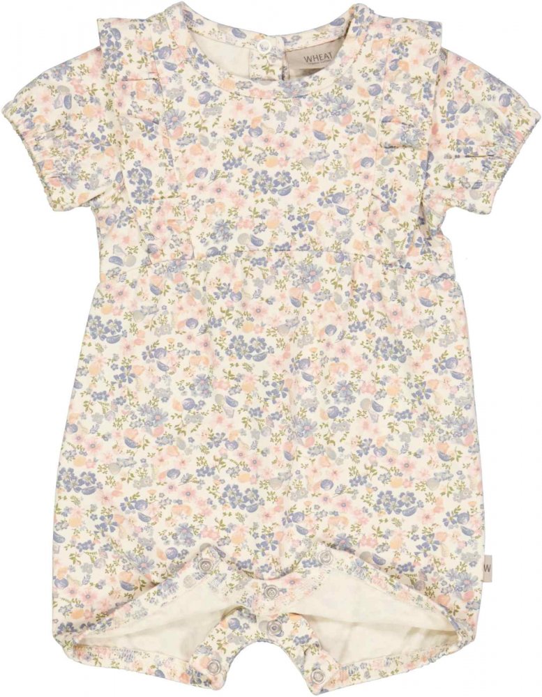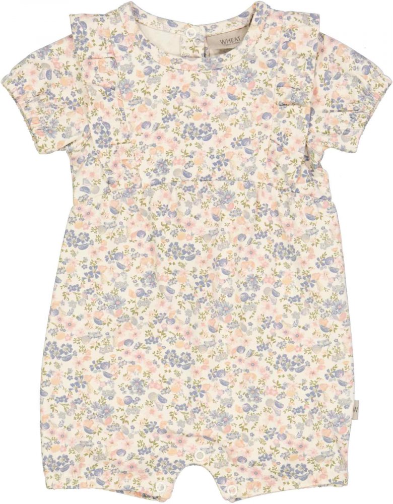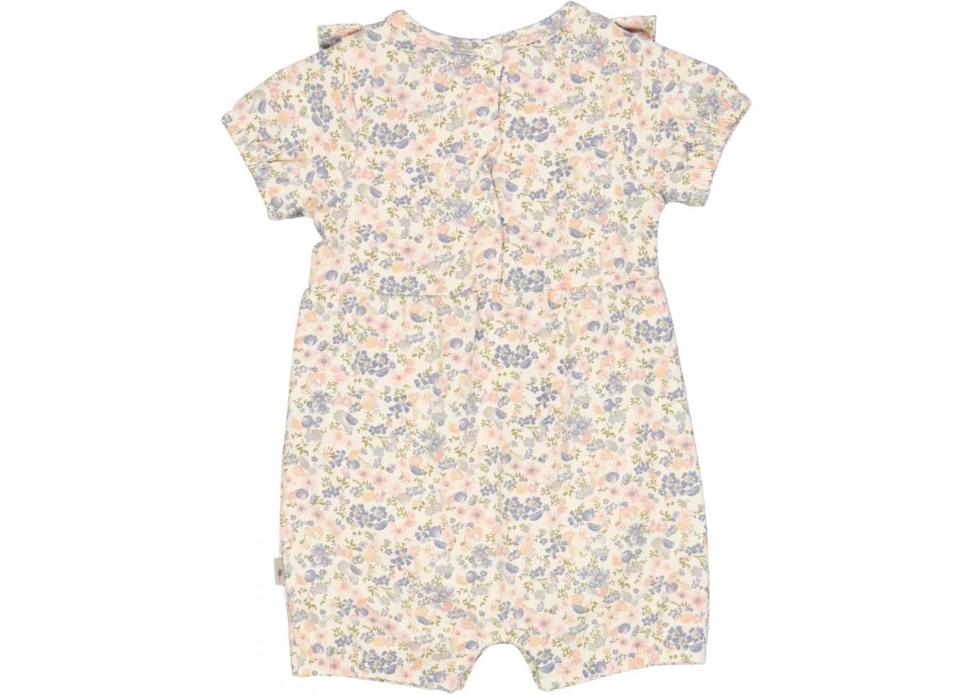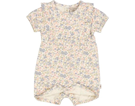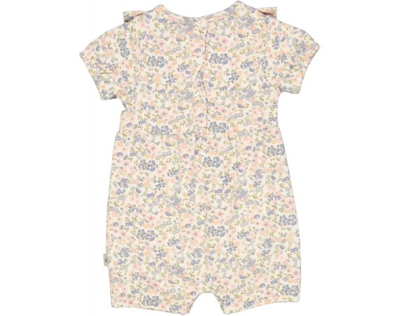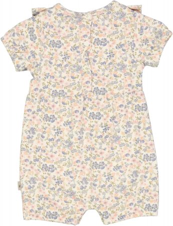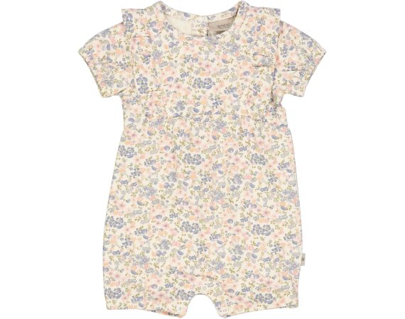 Bedårande beige byxdräkt med söta handritade blommor i en underbar viskosblandning.Dräkten är skuren i midjan, har en fin volangkant på bröstet och ryggen och fin resår i ärmarna. Den stängs med tryckknappar på ryggen och mellan benen.