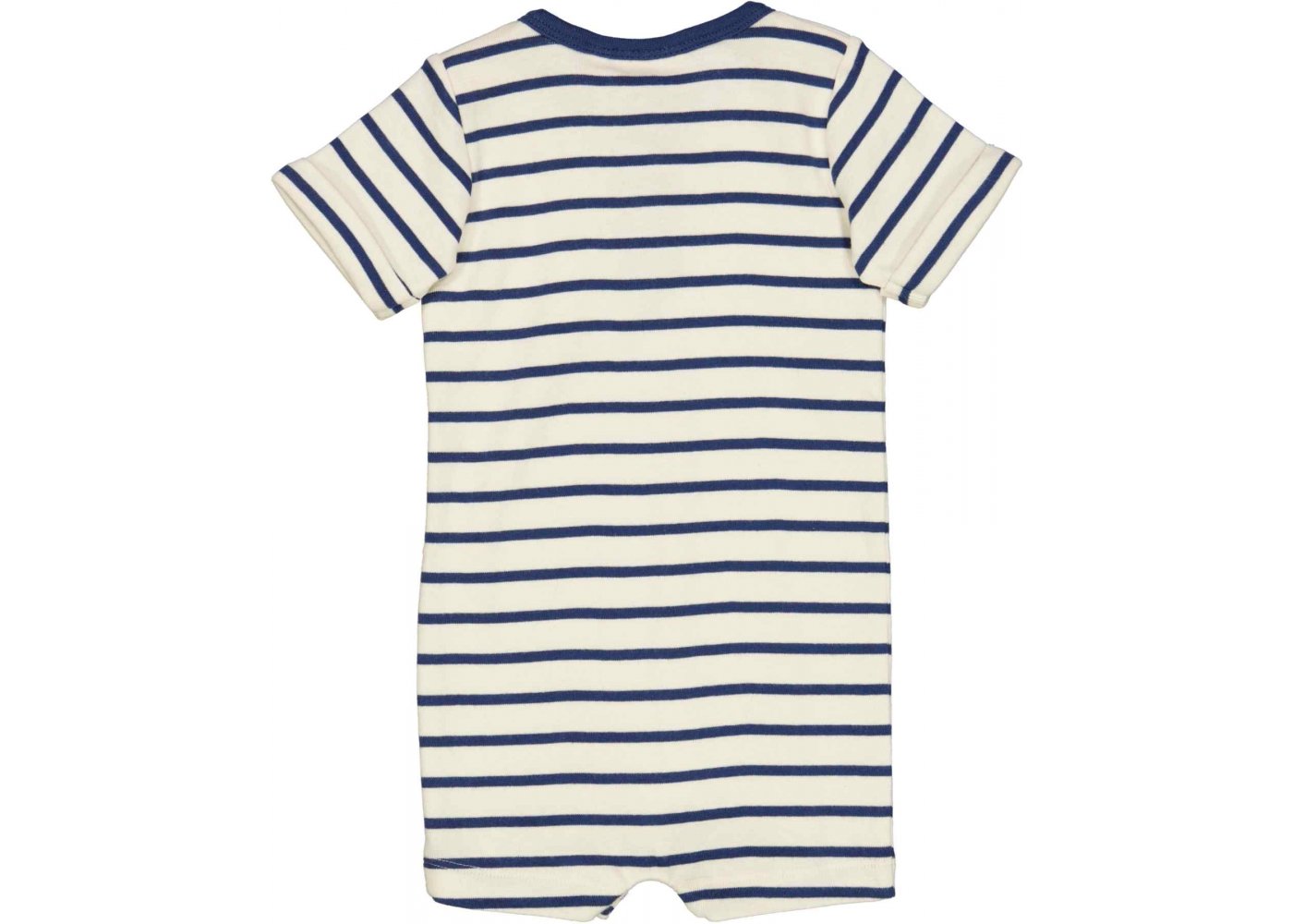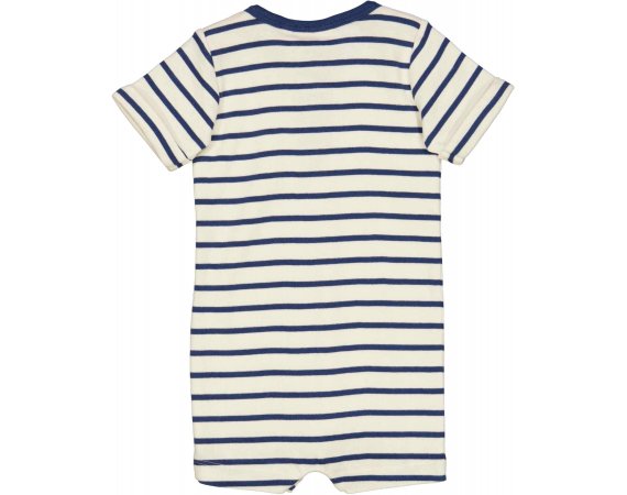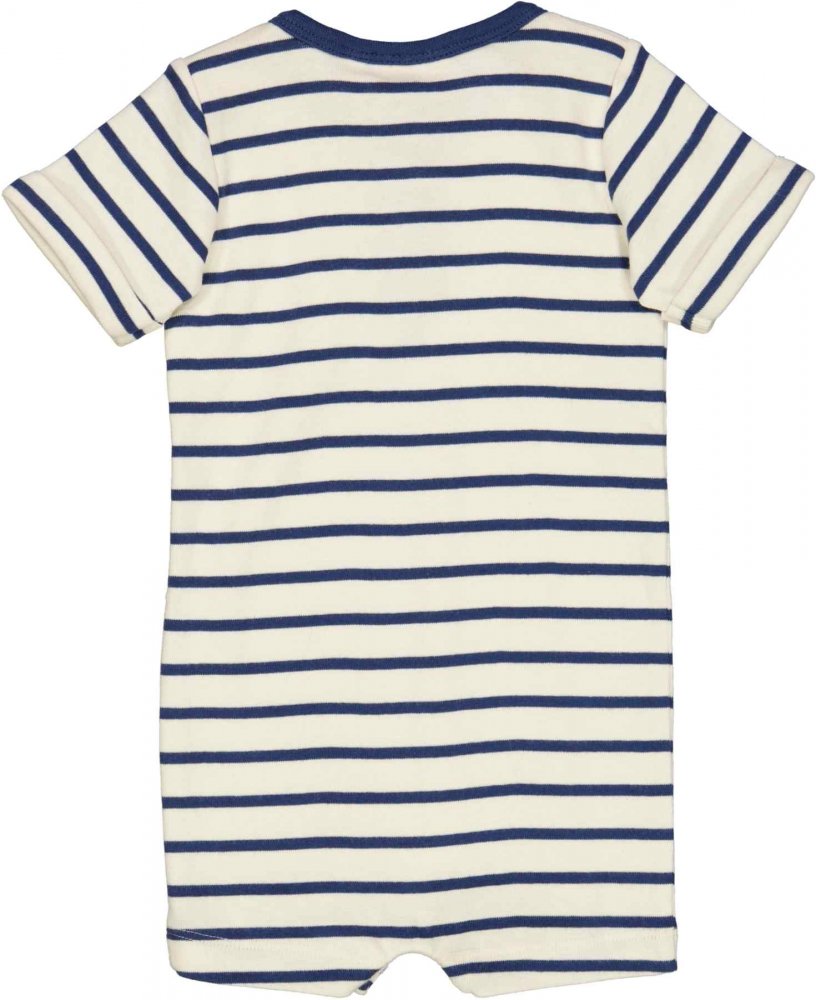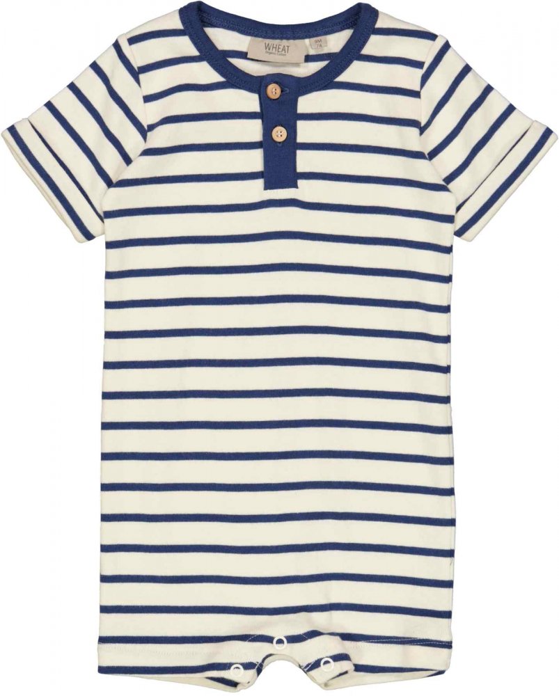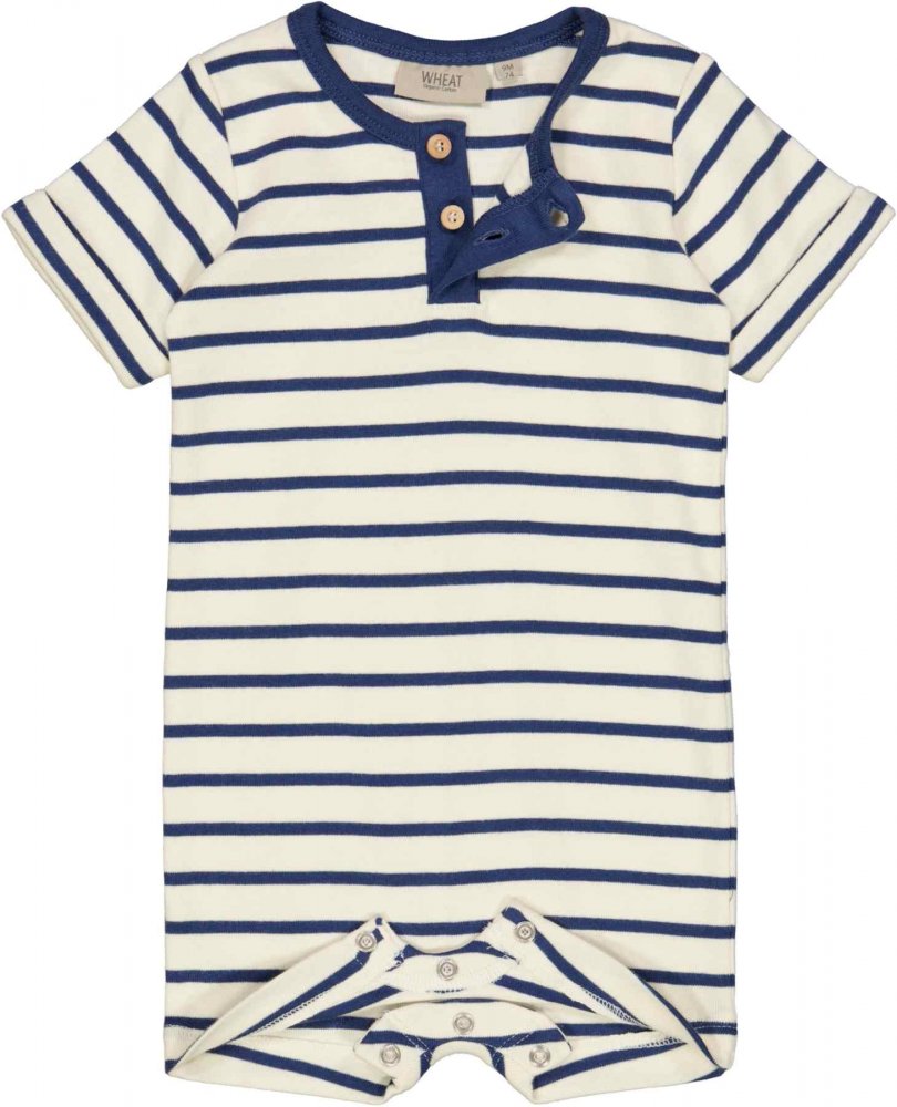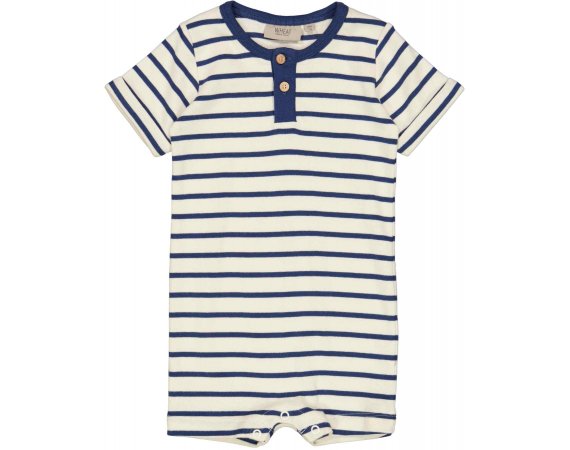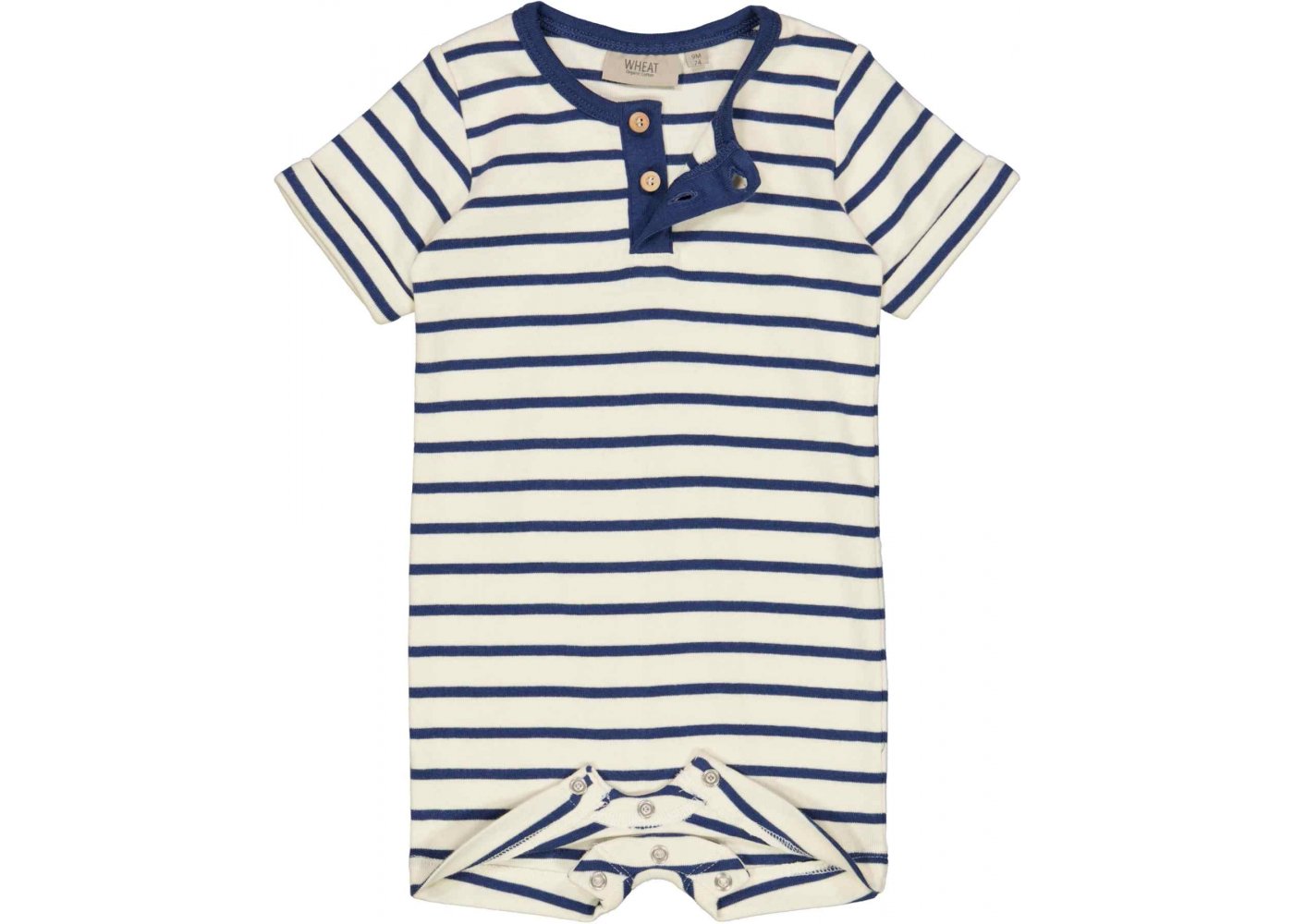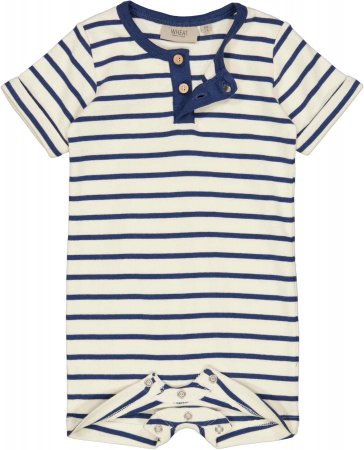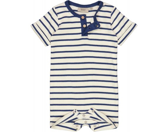 Skön blå- och vitrandig byxdräkt från Wheat.Dräkten har en blå ribbad halsringning och en fin stolpstängning med knappar framtill.