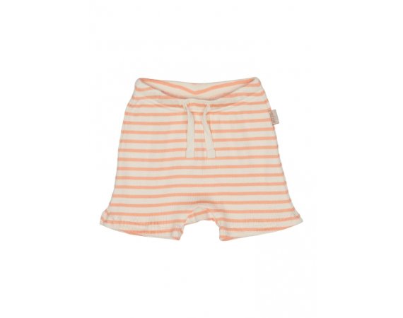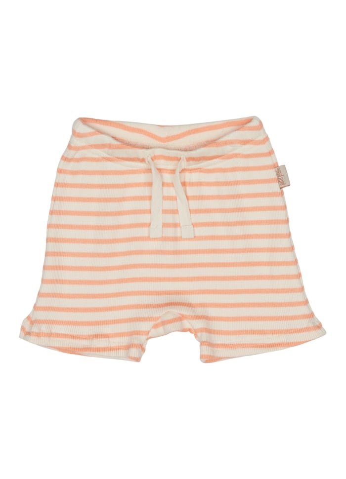 Vackra ribbshorts i persika och krämvitt från Petit Piao.Shortsen har ett knytband i midjan och är gjorda av en skön blandning av bomull och modal.