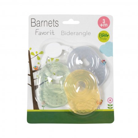 Fin och praktisk bitskallra med tre individuella skallror för att lindra ömma tandkött.Bitskallran är fylld med renat vatten och är lämplig för kylning i ett vanligt kylskåp.