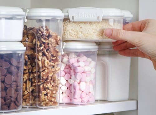 Praktiskt och transparent - Bake It - behållare från Sistema, speciellt utformad för bakning.Behållaren har ett smart lock med extra öppning i toppen, vilket gör det enkelt för dig att hälla och dosera innehållet.