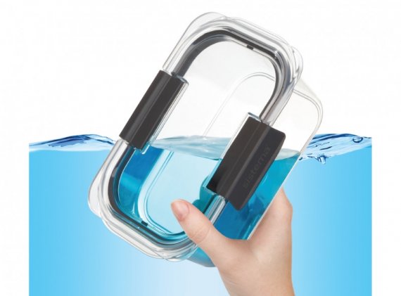 Behållaren är godkänd för mat och är diskmaskinsäker i den översta korgen, kan placeras i frysen och mikrovågsugnen utan lock.