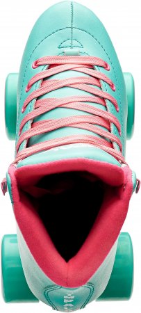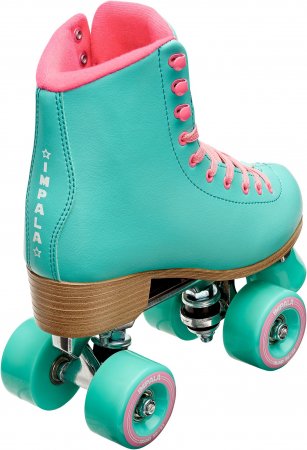 Nostalgiska side-by-side retro-rullskridskor från Impala i turkos och pink.