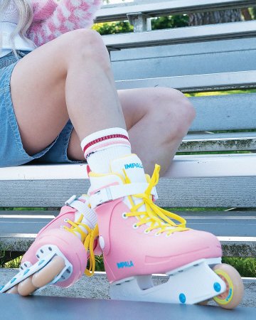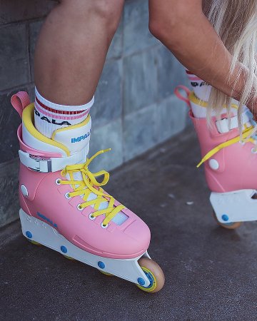 Smarta Inlines rullskridskor från Impala i rosa, gult och vitt.