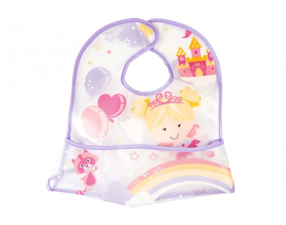 Vattentät haklapp med ficka för att fånga upp matrester och slöseri med mjölk under ätandet, vilket är mycket praktiskt under tiden barnet lär sig att äta själv. Haklappen är full av magi och äventyr - ett slott, en prinsessa och en himmel med regnbågar, stjärnor och hjärtan.