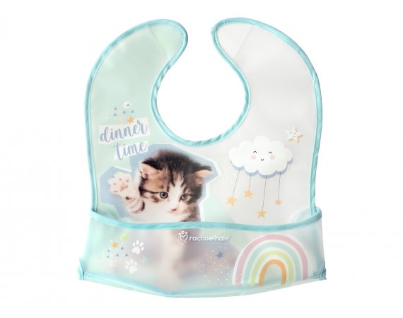 Vattentät haklapp med ficka för att fånga upp matrester och slöseri med mjölk under ätandet, vilket är mycket praktiskt under tiden barnet lär sig att äta själv. Haklappsfickan gömmer den sötaste lilla kattunge som sitter omgiven av regnbågar, moln och stjärnor i de vackraste färger.