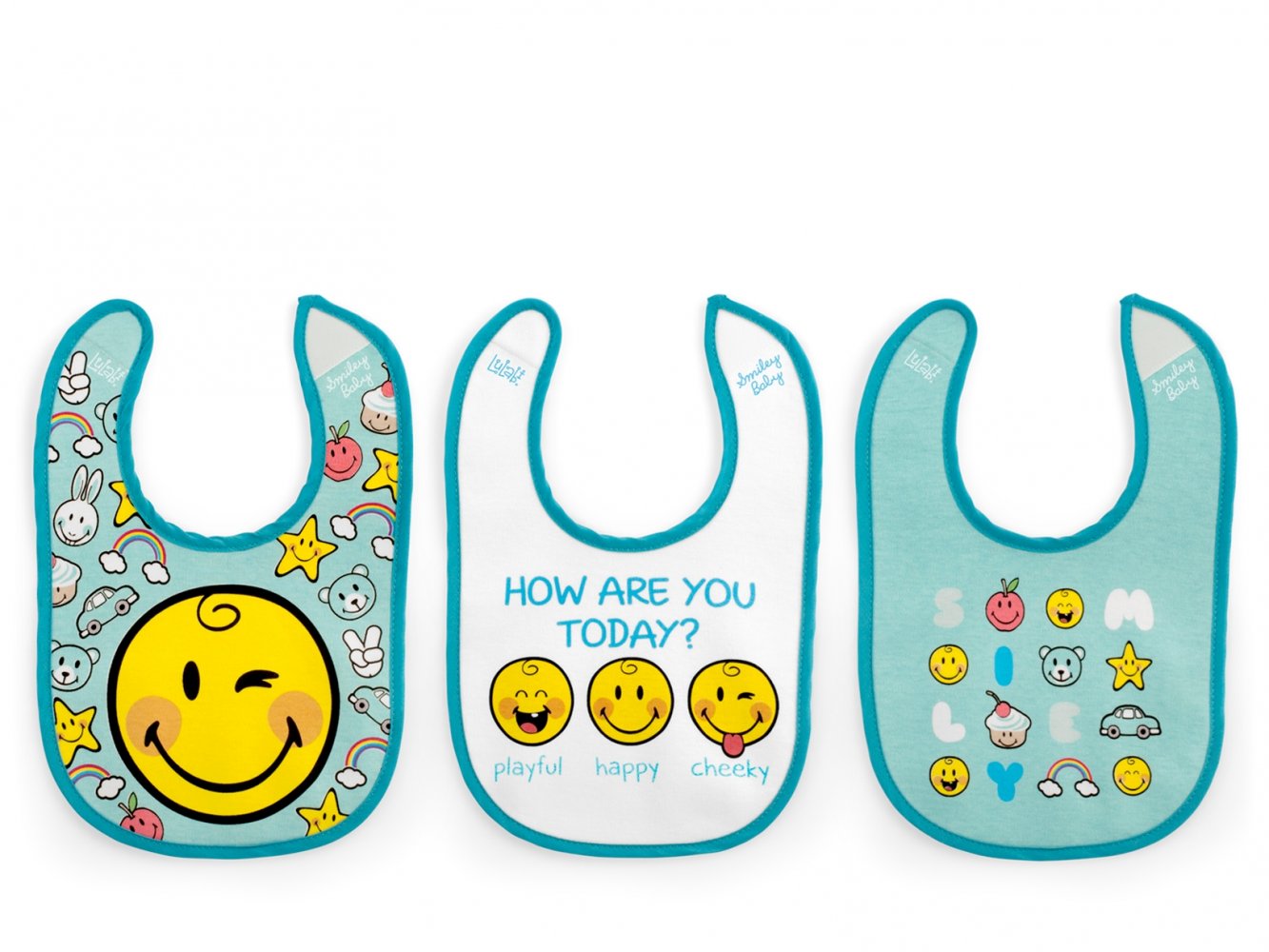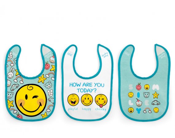 Tre söta haklappar i blått och vitt med smiley och fina motiv.Haklappen har en fin blå kant och stängs med kardborre i nacken.