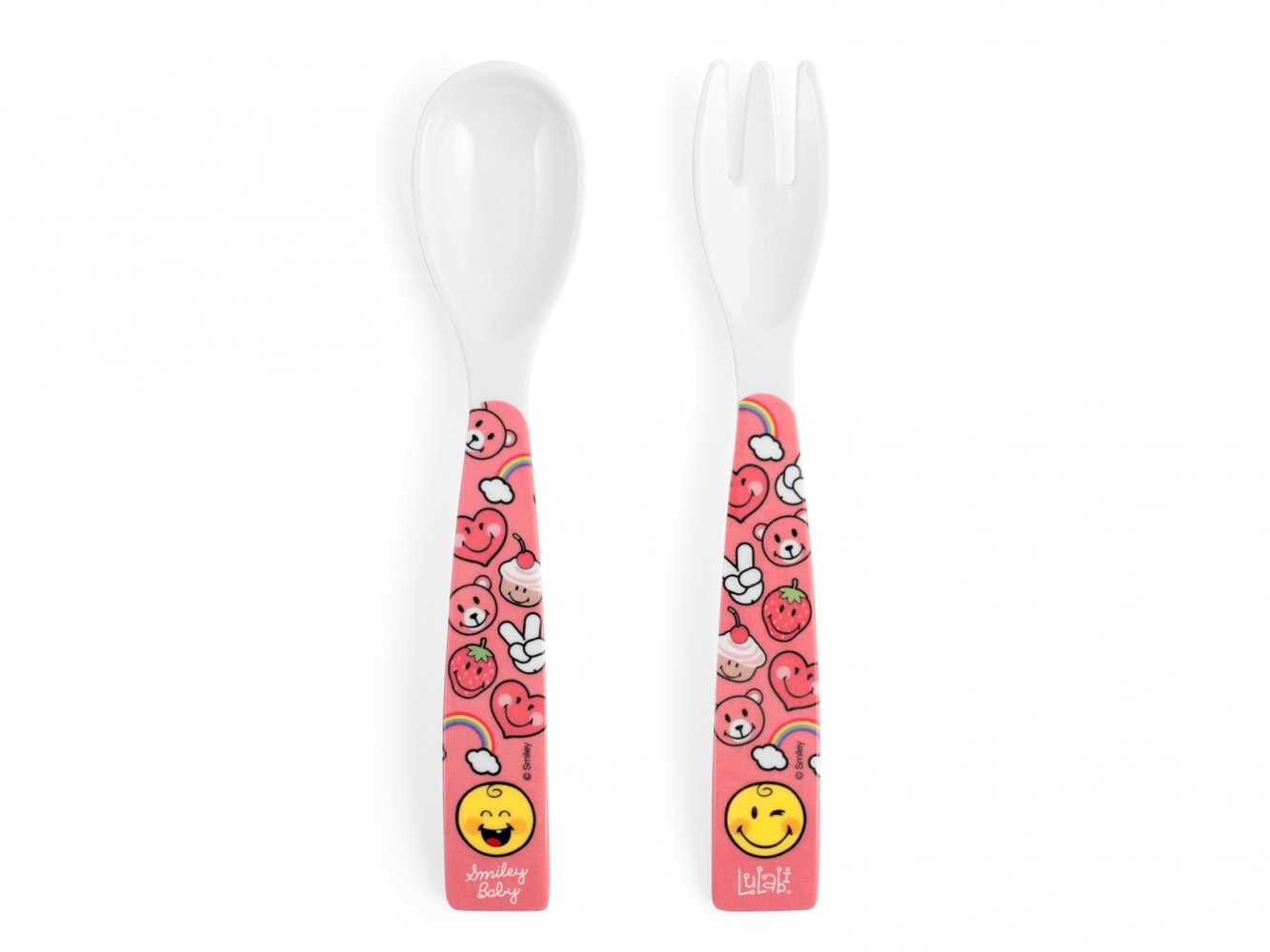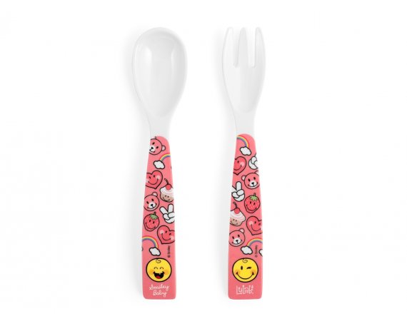 Sked och gaffel är dekorerade med en glad smiley, regnbågar, stjärnor och andra fina motiv.