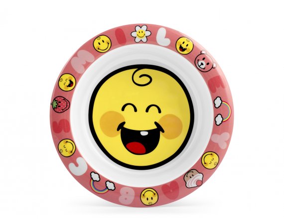 Tallriken har en stor smiley i mitten och en fin rosa kant med olika motiv.