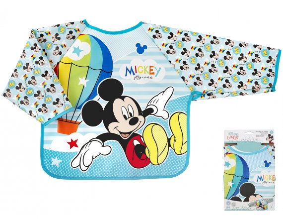 Matförklädet har långa ärmar och är tillverkat av ett vattentätt material som skyddar barnets kläder under måltiden.