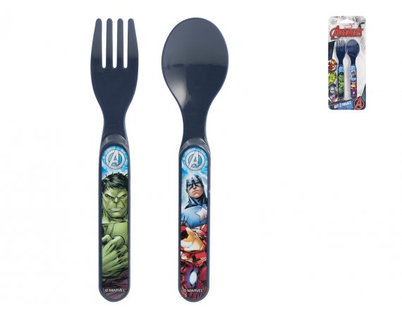Sked och gaffel är dekorerade med coola Avengers Marvel-motiv på skaftet.