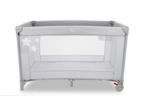 Asalvo Baleares är en elegant, modern resesäng i en vacker färg, som är dekorerad med vackra stjärnor. Den har två hjul som kan bromsas och två stora nätfönster i sidorna.