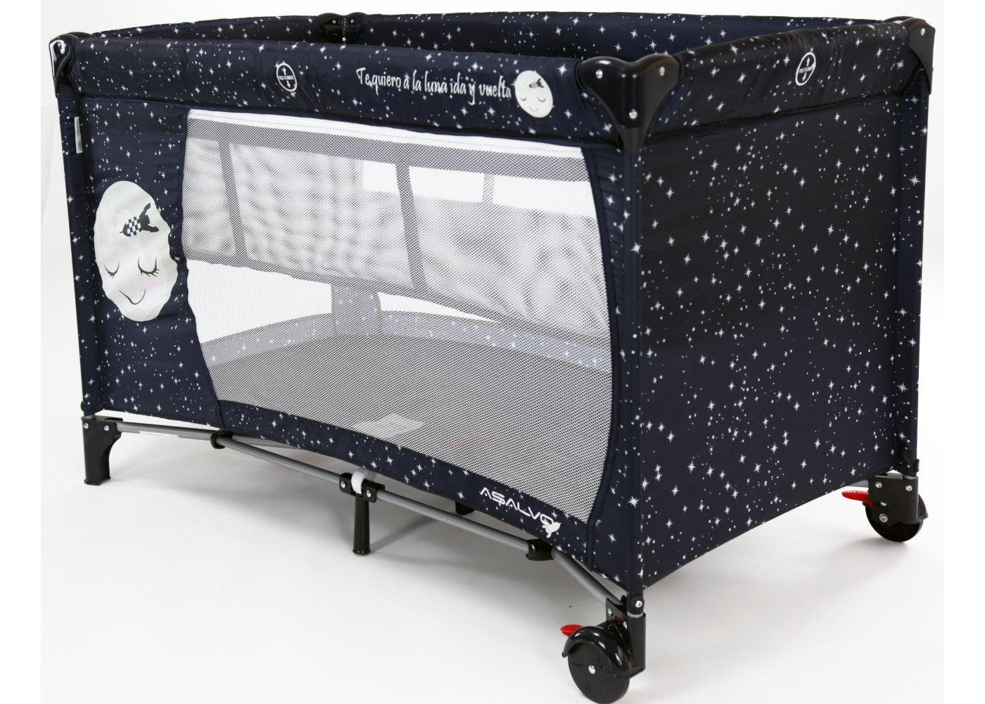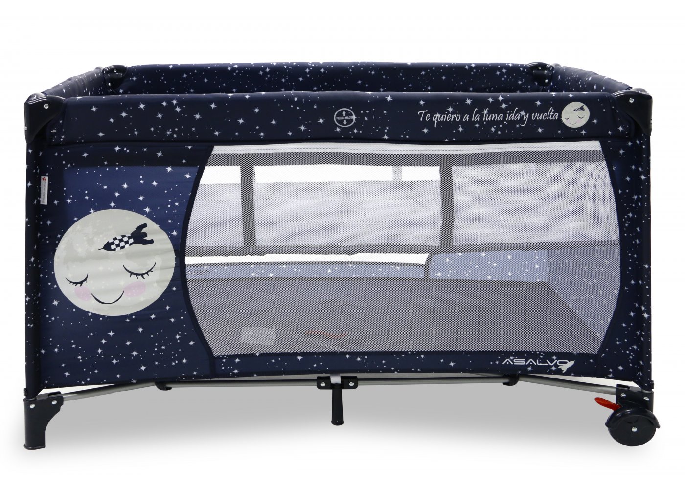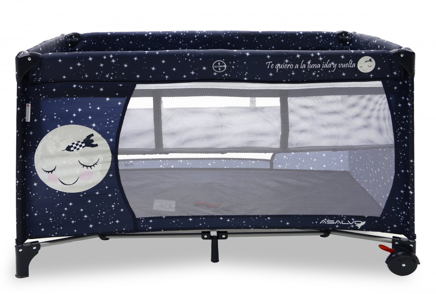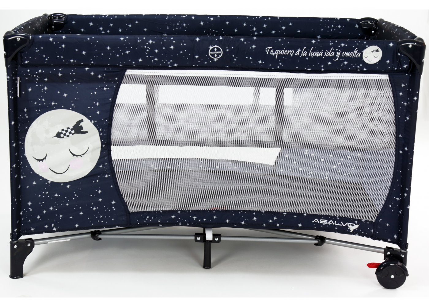 Asalvo Baby är enkel och med en söt illustration på sidan. Den har en smart insats till höjdjustering, för att lägga den lilla bebisen, så att du inte behöver böja ryggen så långt ner i sängen, om du ska ge napp eller gosa lite, vid läggdags. Den kan naturligtvis bara användas till de mycket små bebisarna. När/om du inte längre behöver insatsen längre, tas den lätt ut och resesängen fungerar som en helt vanlig säng.
